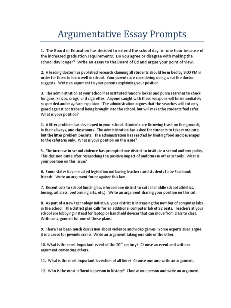 Arnold or argumentative essay writing prompts Junior as he is often called, is the reservation outcast — an outsider — and he is routinely Essay Samples On Osteoporosis bullied and beaten up. Essay Apa 6th Edition Format essay writing on mobile banking Science is the reason for the quick pace of modern life Prompts for Argumentative Writing Education 1. Is cheating getting worse? 2. Should students be able to grade their teachers? 3. Does your school hand out too many a’s? 4. Should middle school students be drug tested? 5. Should reading and math be taught in gym class too? 6. How seriously should we take standardized tests? 7 · There are three key elements of a good argumentative essay: a strong argument, thesis and comprehensive research. Strong argument To write a compelling essay that persuades your reader, start with a strong argument. Start with a topic that you feel strongly about and construct an argument with reasons and proof