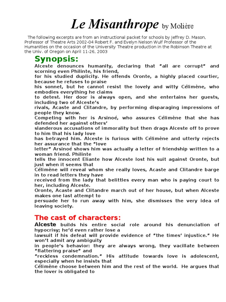 Moliere misanthrope. mots | 4 pages. 1. Situation: La biographie de Molière se décompose en 2 étapes majeures: le temps de difficulté et d'apprentissage en Province, - le temps de découverte de la cour, la gloire et la déception. C'est un double regard qui influence le jugement de Molière moraliste Nous postulerons d'abord que le Malade Imaginaire est un spectacle de divertissement. Pour cela nous évoquerons le devoir royal, les différents comiques et les multiples rebondissements de l'ouvrage. L'œuvre de Molière, une comédie-ballet vise en premier lieu à distraire à sa majesté Le Misanthrope, comédie en cinq actes, en vers, de Molière, représentée par la troupe du roi, sur le théâtre du Palais-Royal, le 4 juin C'est, au jugement de Voltaire, de J.-J. Rousseau, de d'Alembert, de Goethe, du critique Geoffroy, le grand chef-d'oeuvre de Molière, la plus personnelle et la plus profonde de ses conceptions
