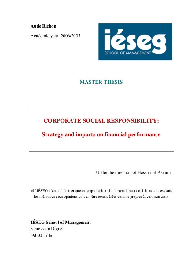 Master Thesis Determinants of corporate social responsibility disclosure: empirical evidence from Bulgaria Mariya L. Lyubenova, s MSc Business Administration Track: Financial Management Keywords: Corporate social responsibility (CSR), CSR · Corporate social responsibility or CSR can provide organizations with benefits many benefits especially in relation to their working environments. CSR is the ideal of turning an organization into a citizen within the community it is working in, by making a concerted effort to commit services to their environment. Organizational commitment is In order to complete a master thesis at the Chair of CSR, you are required to first take part in the Chair’s research seminar. For other formal requirements, see your respective “Prüfungsordnung”. As described above, there are two ways to determine a thesis topic: First, you can check the list of proposed topics on our website